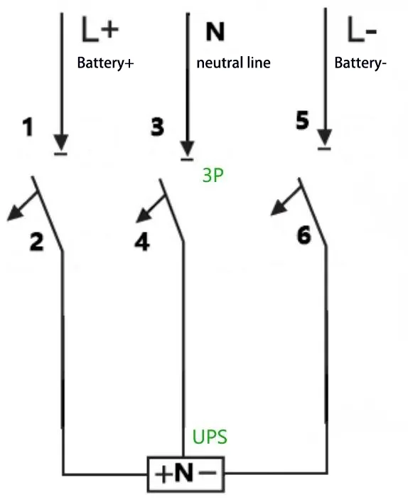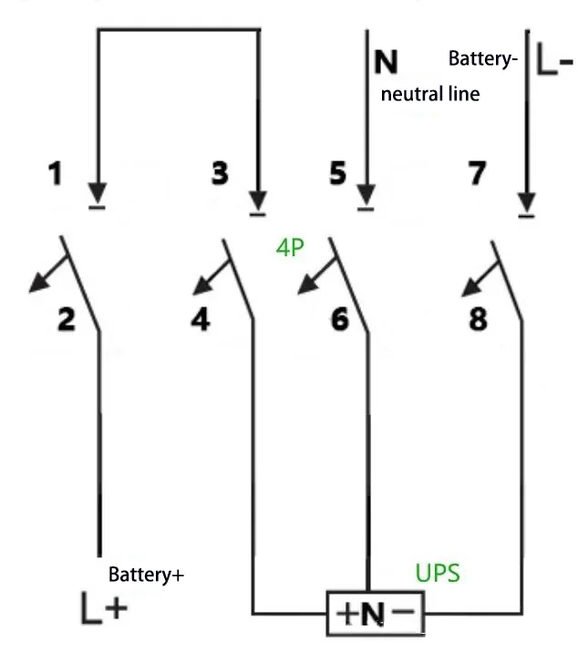 E:उदाहरणका लागि: 40 kVA क्षमता भएको UPS को लागि, 40 सेलहरूको मूल्याङ्कन गरिएको ब्याट्री स्ट्रिङ, र तटस्थ तार जडान (समान चार्ज भोल्टेज: 14 V × 40 = 560 V, अर्थात्, ±280 V), अधिकतम अपरेटिङ करन्ट 40 kVA × 4 ÷ 0 ÷ 0 ÷ 0% 0 ÷ 1 को रूपमा गणना गरिन्छ। 111 A. A 4P 750 V 150 A सर्किट ब्रेकर अपनाउन सकिन्छ, जसका दुई ध्रुवहरू श्रृंखलामा जोडिएका छन्। तारिङ विधि निम्नानुसार छ:
